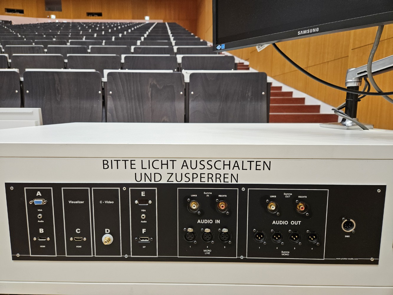Tafel und Projektor können (begrenzt) parallel benutzt werden, es können bis zu 4 Quellen gleichzeitig projiziert werden; Physikhörsaal, Hörsaalverbund mit HS P2, P3, SR TDK für Veranstaltungen; Betreuung für Veranstaltungen empfohlen